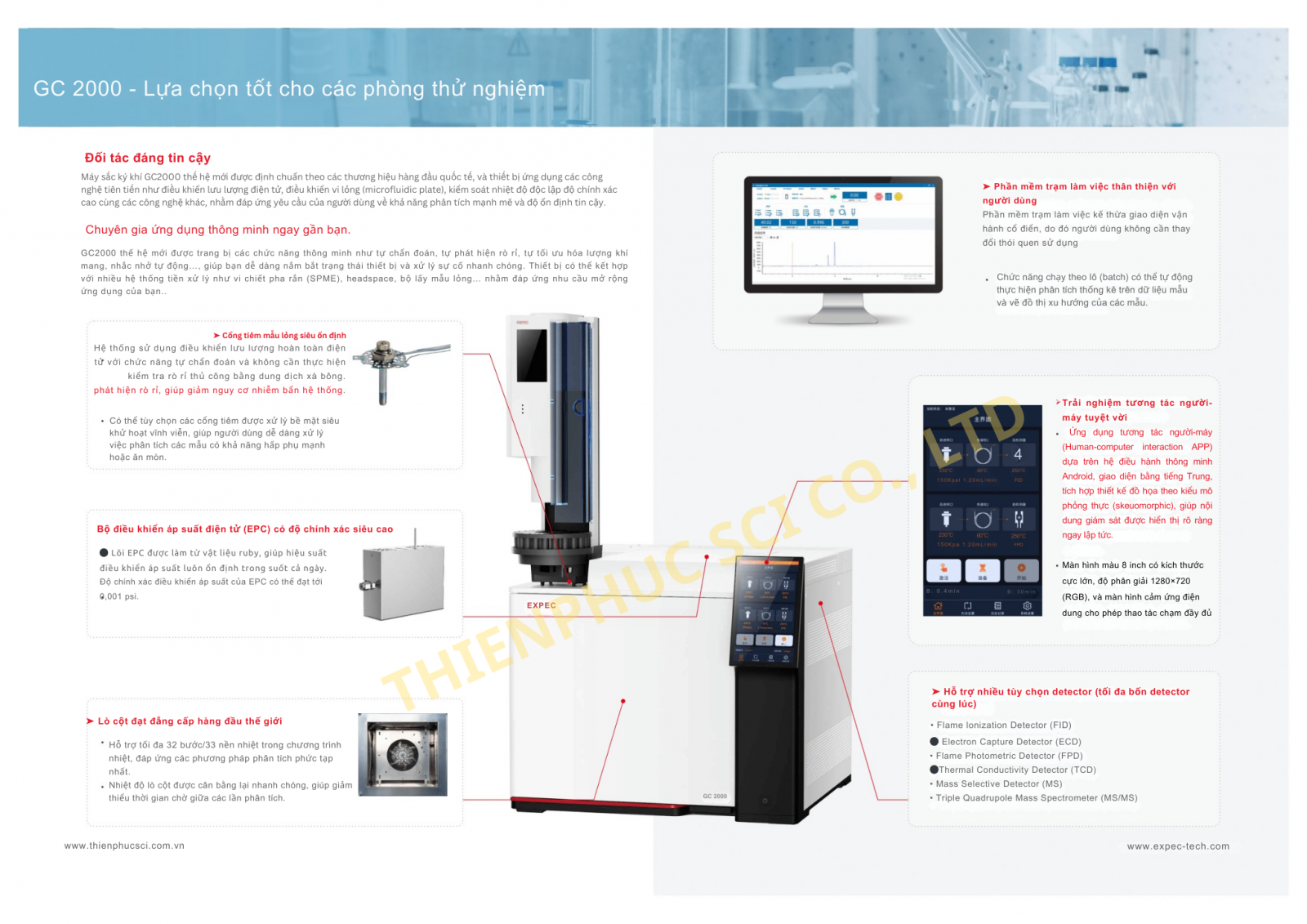 EXPECH GC-2000 tích hợp nhiều tính năng thông minh như tự chẩn đoán, phát hiện rò rỉ, tiết kiệm khí mang và hệ thống nhắc nhở tự động, giúp người dùng dễ dàng theo dõi tình trạng thiết bị và xử lý sự cố kịp thời. Hệ thống có thể kết nối linh hoạt với các thiết bị tiền xử lý như SPME, headspace hoặc bộ lấy mẫu lỏng (automatic liquid injector), đáp ứng tốt nhu cầu mở rộng ứng dụng trong nhiều lĩnh vực phân tích.